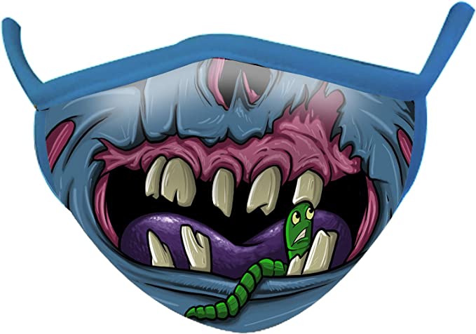 - Washable sublimation printed fabric with zombie monster design. Covers from nose to chin for a secure and comfortable fit. Flexible, non-elastic, fabric ear straps. Does not have a metal nose piece.